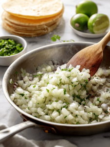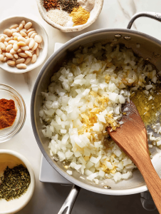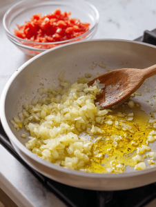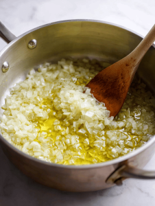 - Heat olive oil in a large heavy-bottomed pot over medium heat until shimmering. Add diced onion and cook, stirring occasionally, until translucent and fragrant, about 3-5 minutes. The onions should be soft and fragrant, with a slight sizzle.