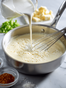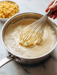 - Gradually pour in the milk and heavy cream, whisking continuously to create a silky cheese sauce. Keep the heat moderate to prevent curdling; the sauce should thicken slightly and become smooth.