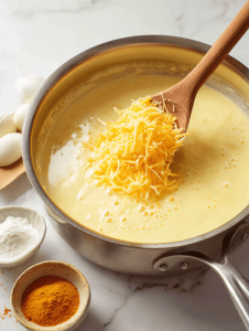 - Add the shredded cheddar cheese to the sauce, a handful at a time, whisking until each addition melts completely before adding the next. Continue until the sauce is rich and smooth.